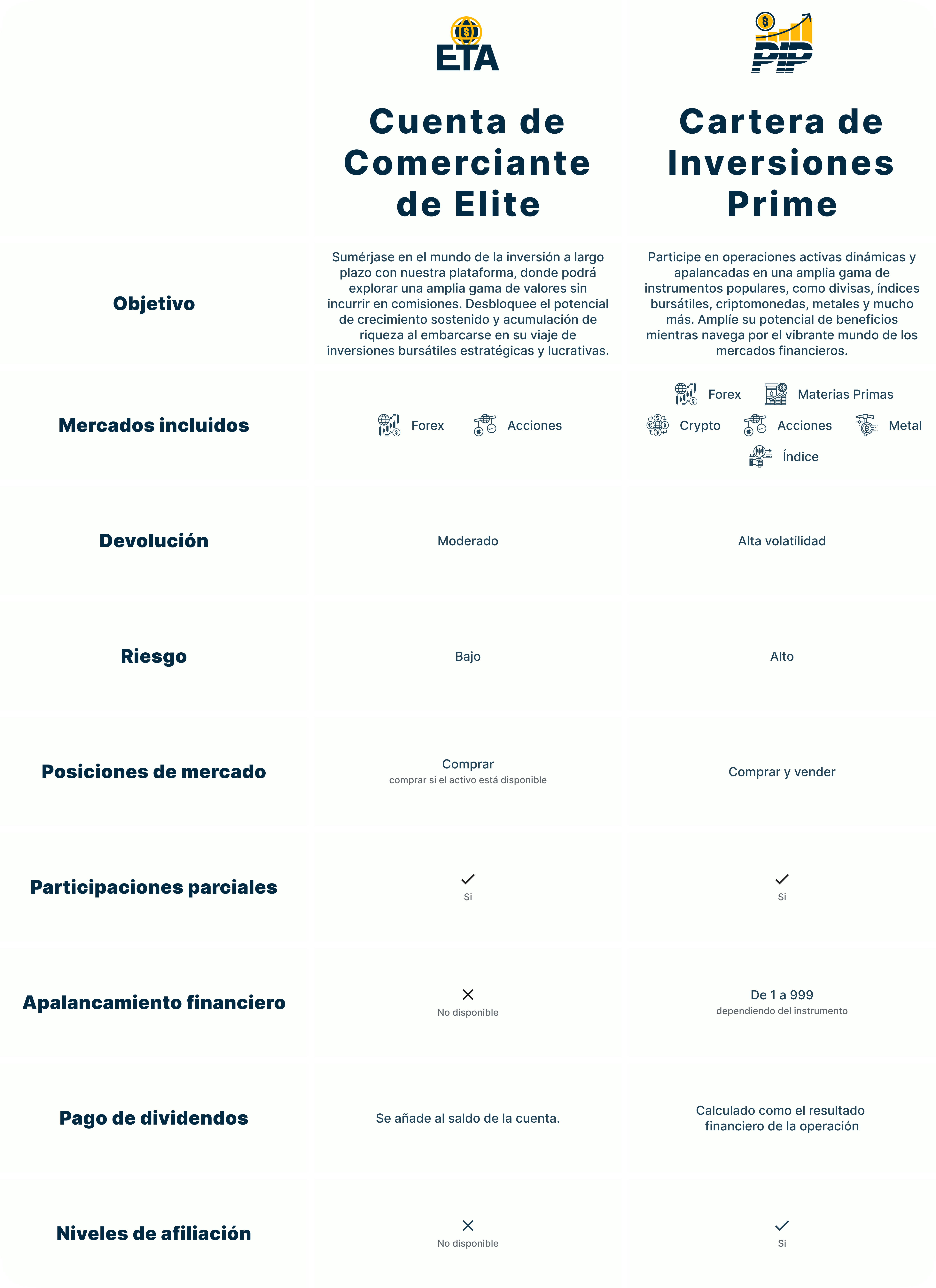 Libere el poder de la negociación de precisión con nuestra cuenta ETA. Diseñada para operadores exigentes, esta cuenta ofrece una experiencia refinada con herramientas avanzadas y funciones exclusivas. Eleve su experiencia de trading a nuevas cotas y explore un mundo de posibilidades.